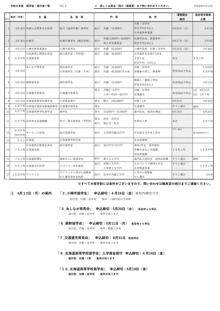 令和8年度の奨学金・貸付金(本校関係以外が主催するもの)の一覧です。